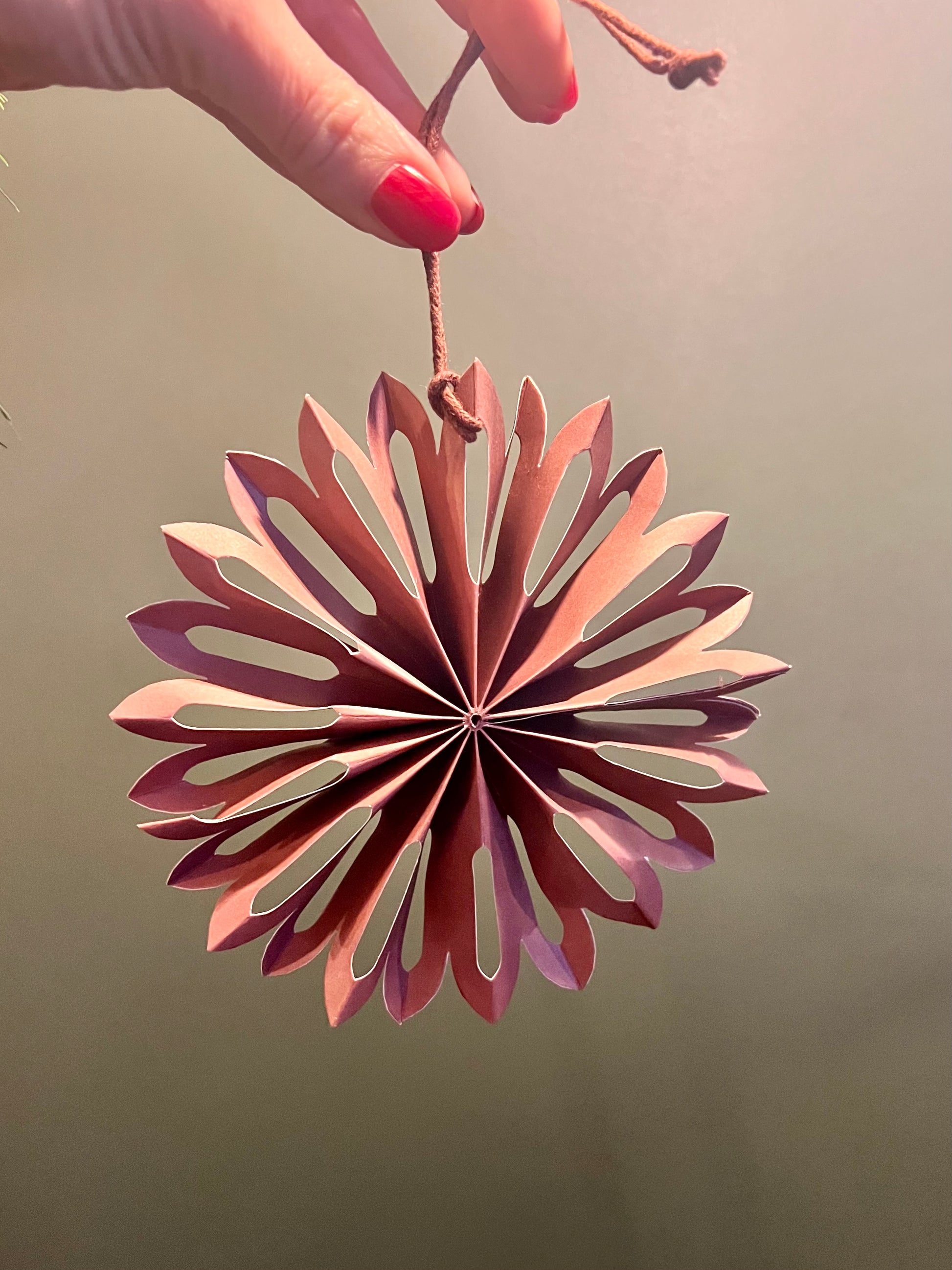 Papieren kerstboomhanger in de kleur bruin/rood, in bloemvorm