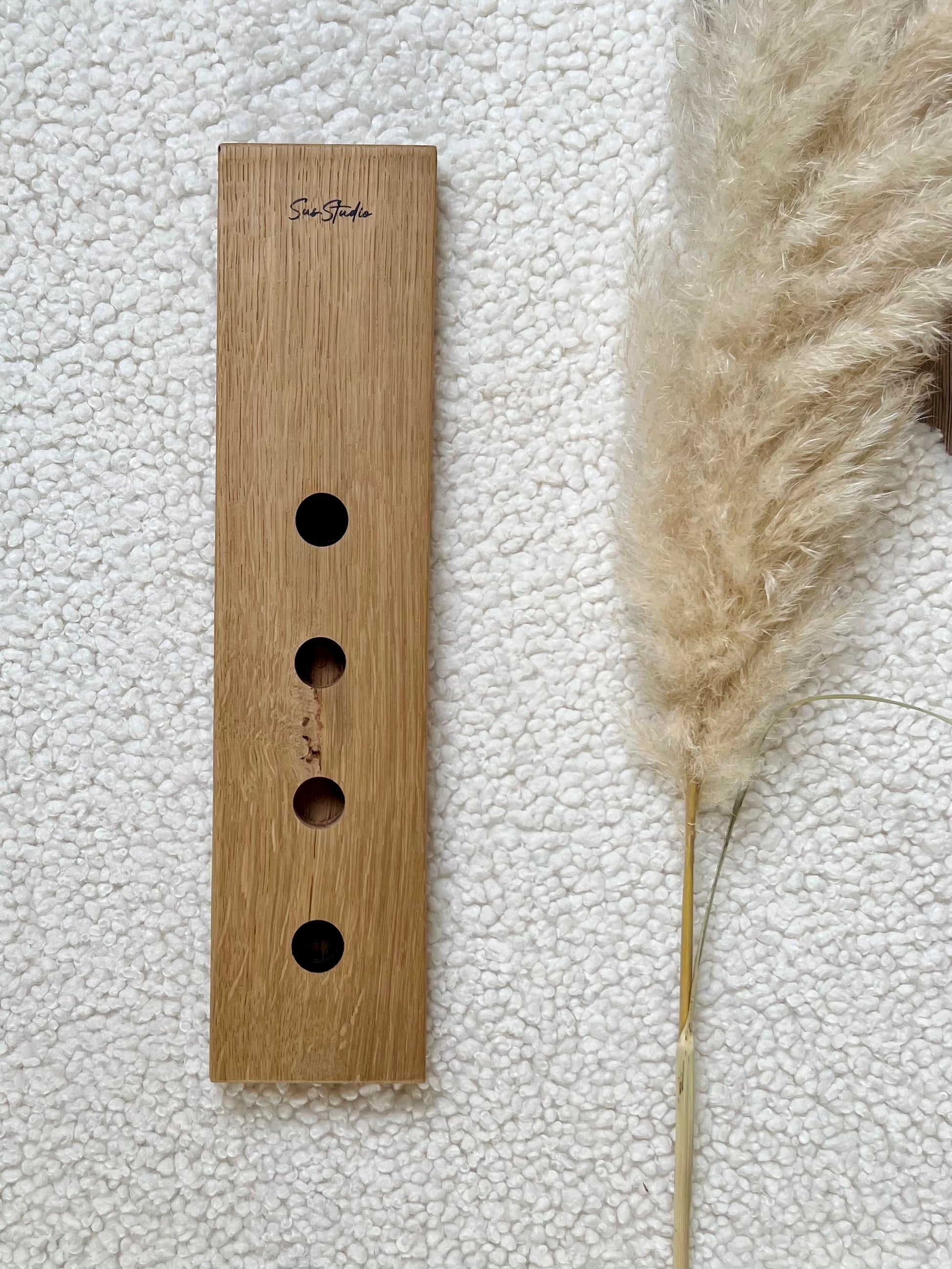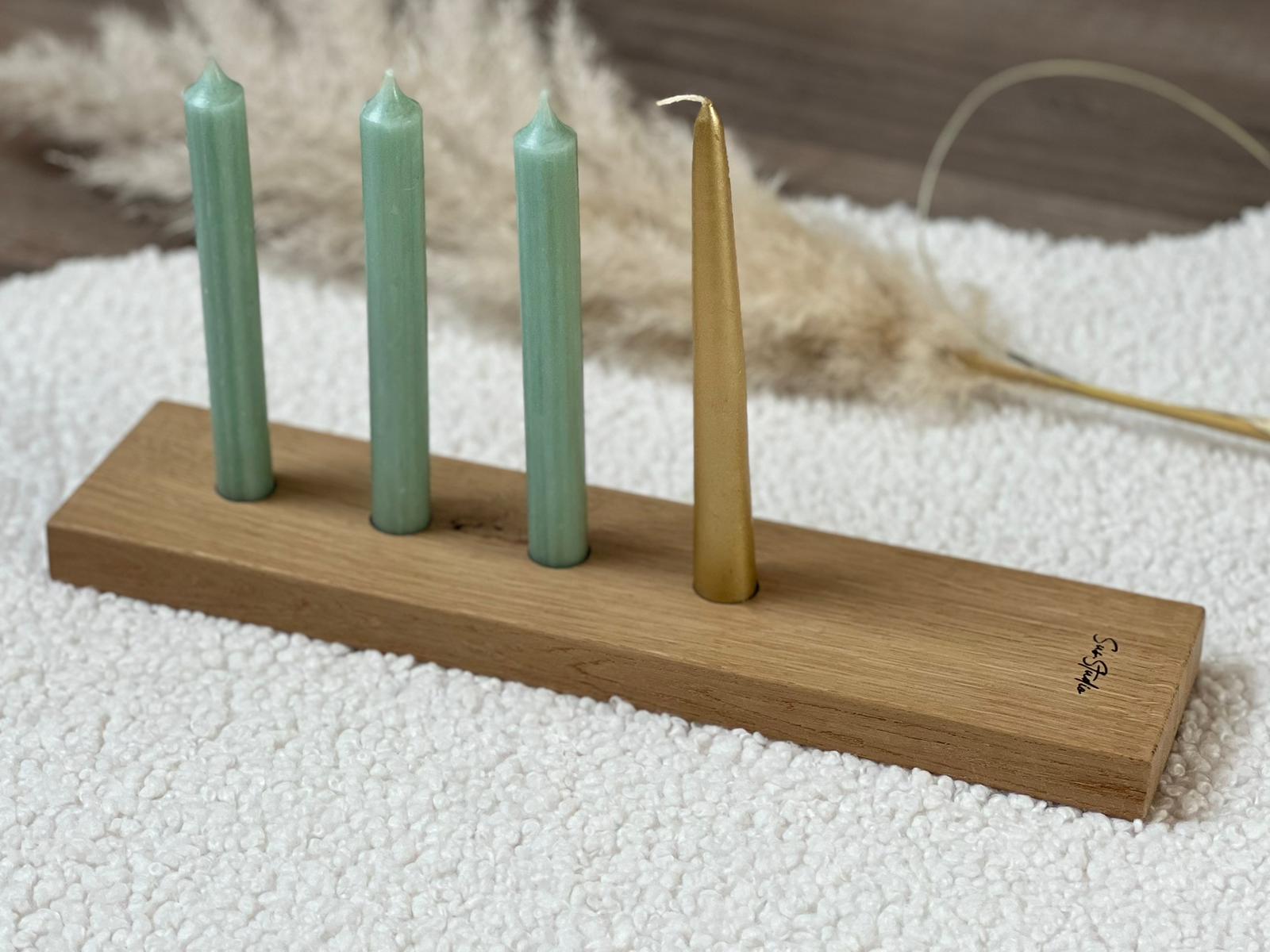 De ene kant van de plank heeft kant & klare openingen (4 stuks) om je kaarsen makkelijk in te zetten. De diameter van de openingen is 2,1cm en daarmee geschikt voor de meeste kaarsen.