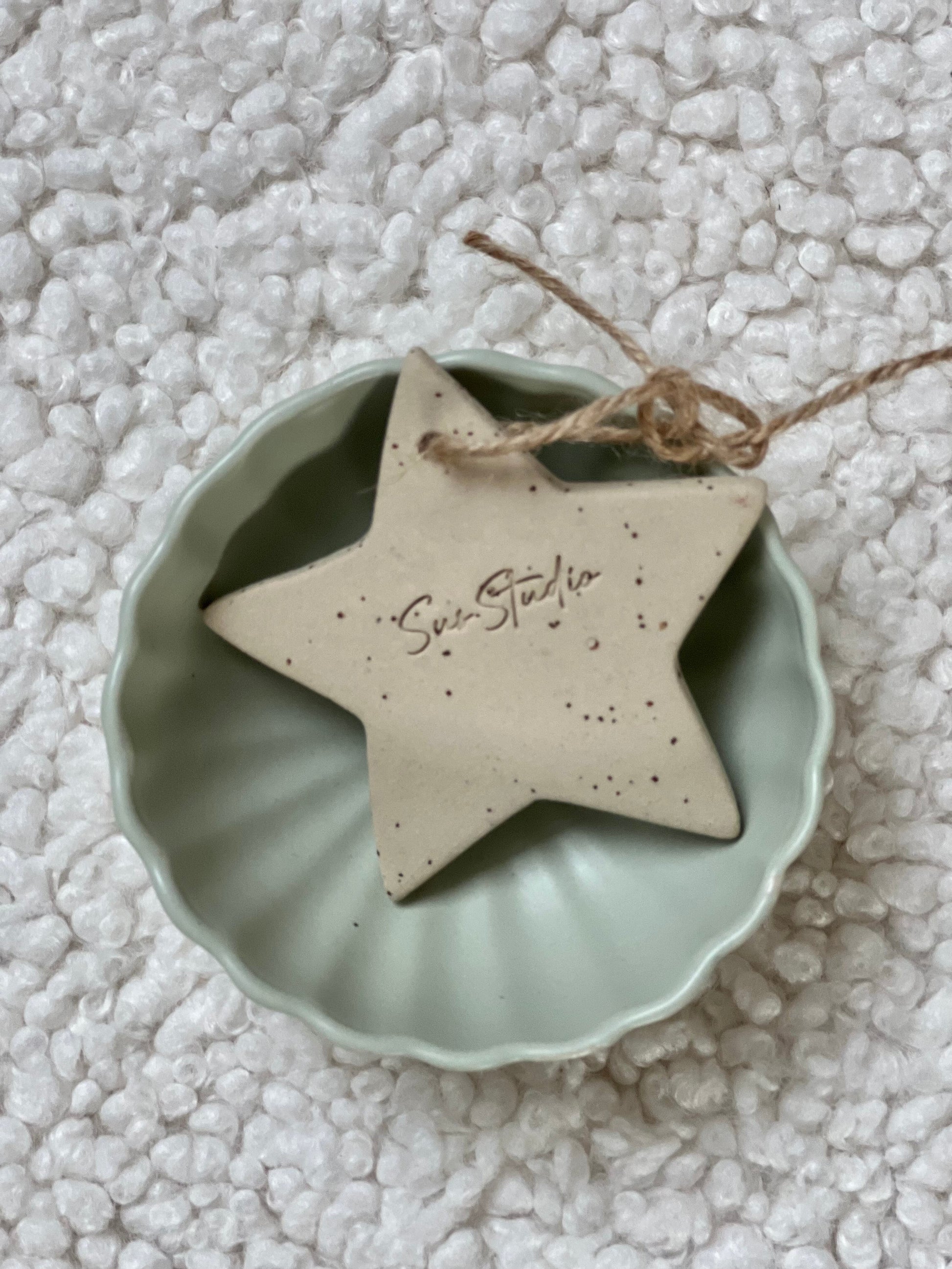 Kerstboomhanger van onbewerkt keramiek, met het Sus.Studio logo erop